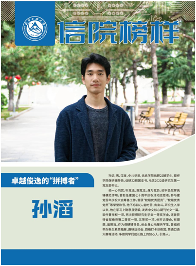 孙滔,男,汉族,中共党员,永利集团yl6809官网信研22班学生,现任学院保研辅导员,信研22班团支书,电信2022级研究生第一党支部书记。