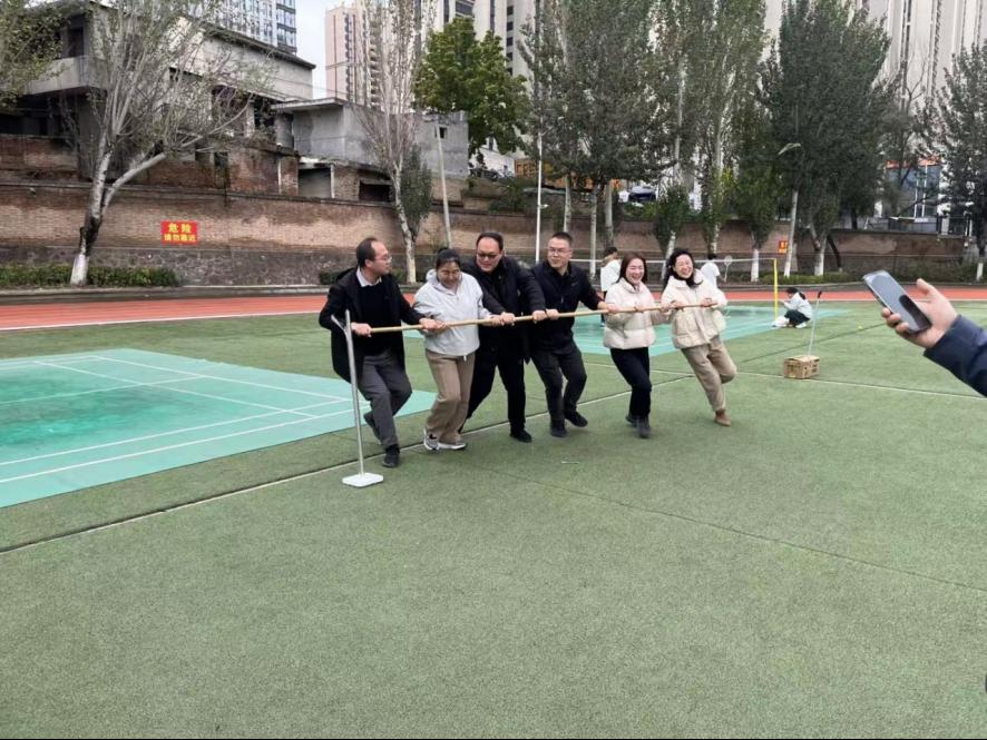 上午9:30,师生们齐聚西操场,运动会在热烈的掌声中拉开帷幕。全体教职工组成4支参赛队伍进行趣味比赛。赛场上,平日里专注教学与办公的教职工们瞬间切换“运动模式”,队员们步伐一致、口号响亮,默契协作向终点冲刺,展现出了十足的凝聚力。运动场上的笑声此起彼伏,气氛十分热烈。