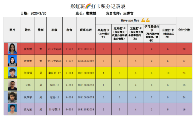 自新冠病毒肺炎疫情爆发以来,永利集团yl6809官网为切实做好留校学生的思想引领、学习教育及服务管理工作,凝聚战“疫”力量,组织留校学生临时成立“彩虹班”(寓意“风雨袭后,终见彩虹”)。在班主任王秀吉老师的带领下,“彩虹班”的学生们发起“Give me five校园防‘疫’行动”,每天通过早起打卡、运动打卡、卫生打卡、学习思想打卡和公益打卡5种打卡方式,养成良好的学习生活习惯,提高自身免疫力,增强社会责任感。