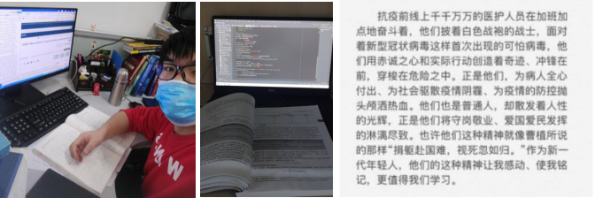 Five之“学习思想打卡”——作为一名学生,学习依然是其最主要的任务。“彩虹班”的同学们每天进行专业学习和政治学习打卡,将学习的场景定格在照片中发送到班级群,不仅可以实现自我监督,还能够感染其他同学一起学习,共同进步。一些同学还撰写了感想,在班级群中相互交流心得。