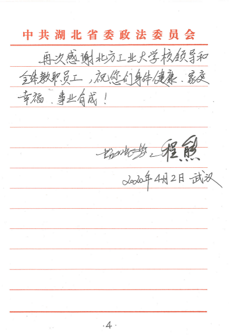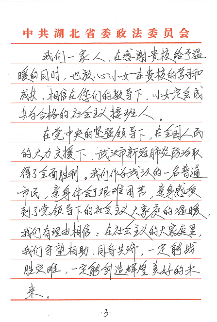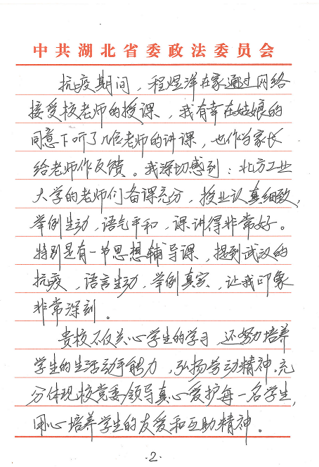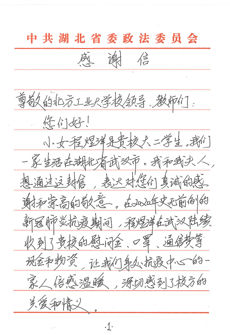 “小女程煜洋是贵校大二学生。我们一家生活在湖北省武汉市。我和我的夫人,想通过这封信,对您们表达真诚的感谢和崇高的敬意。在2020年史无前例的新冠肺炎抗疫期间,程煜洋陆续收到了贵校的慰问金、口罩、通信费等现金和物资,让我们身处抗疫中心的一家人倍感温暖,深切感到校方的关爱和情义……”。这是4月3日永利集团yl6809官网辅导员杨和家收到的一封来自通信18-3班程煜洋同学家长的感谢信,全文600余字,饱含了身处武汉抗疫中心的一家人对学校学院在疫情期间给予关心关爱的深切感激之情。