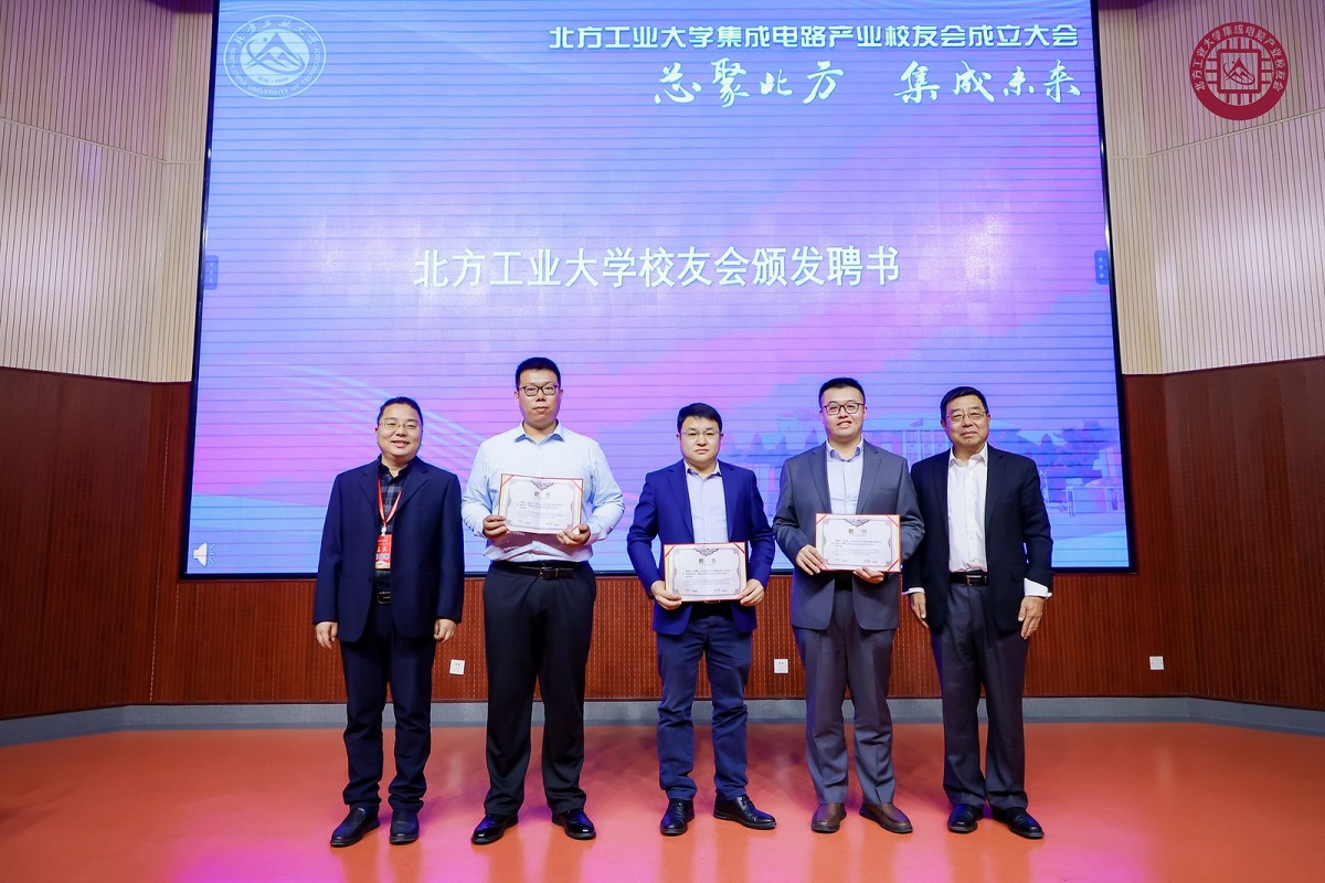 集成电路产业校友会经历了两年多的酝酿和筹备,在学校第77个校庆日举行成立大会。微电子专业08级校友温佳欣作为筹委会代表汇报了校友会的筹备过程。大会选举产生了集成电路产业校友会第一届理事会名单,其中袁立栋(03级微电子专业、国汽智控(北京)科技有限公司总经理)、周锡刚(05级电信专业、金蚂蚁集团董事长)、温佳欣(08级微电子专业、摩尔线程智能科技有限公司资深工程师)分别当选集成电路产业校友会第一届会长、常务副会长、秘书长。学院党委书记王伟宾为校友会授旗,并与闫江教授一同为当选的会长、常务副会长、秘书长颁发聘书。