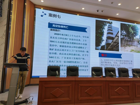 为扎实做好学生实习期间的安全教育,学院特别邀请了实习单位代表三和数码测绘地理信息有限公司安全部门负责人和江泰保险经纪公司负责保险理赔负责人,两位负责人分别从企业安全生产期间的安全注意事项和学生实习安全教育警示案例做了辅导报告。
