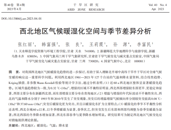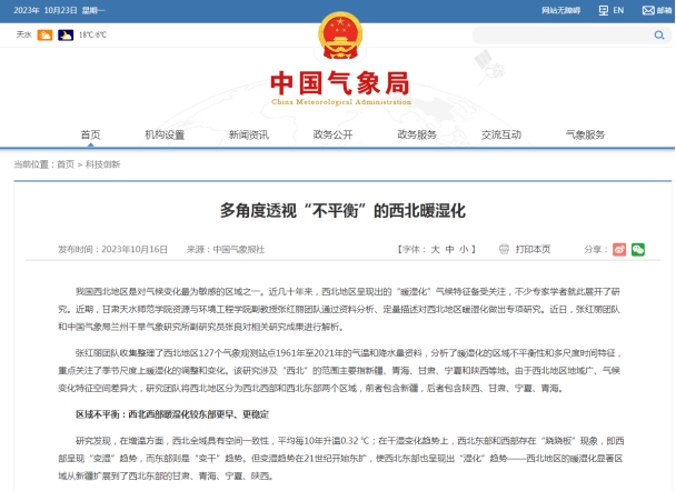气候变化不仅影响人类生存环境,也将影响世界经济和社会进步。在全球变暖背景下,深入研究我国西北地区气候暖湿化趋势,对于理解北半球中高纬干旱半干旱区对全球气候变暖的响应这一重要科学问题具有重要意义。近期,Beat365官网副教授张红丽团队于2023年4月发表在《干旱区研究》期刊上的研究成果“西北地区气候暖湿化空间与季节差异分析”被中国气象局深度报道。