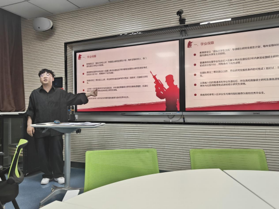 接下来辅导员详细解读了参军入伍相关政策,重点介绍了高校大学生应征入伍特有的优先考学提拔、补偿学费、退役后享受就学就业优惠等优抚政策,就同学们关心的事项进行了解答。在政策讲解中,辅导员一再激励同学们要心怀家国梦想,树立责任担当,积极响应国家的征兵号召,踊跃报名入伍,到部队中施展才华,为国防事业贡献力量。